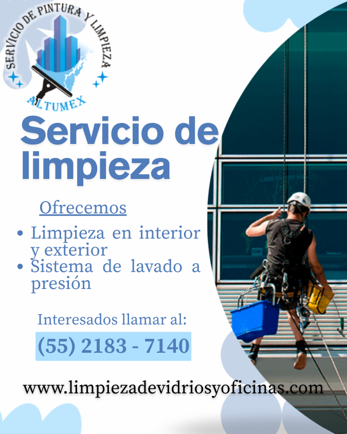 ALTUMEX, es una empresa que ofrece servicios de limpieza de vidrios en altura en la cdmx y mantenimiento en general, proporcionamos beneficios para tu empresa al contratarnos ya que los servicios de limpieza que ofrecemos no sólo es realizar limpieza de vidrios en altura si no es mantener lugares limpios y libres de infecciones y sobre todo obtener un lugar agradable donde puedan trabajar en armonía creando un ambiente laboral saludable y sobre todo limpio.
