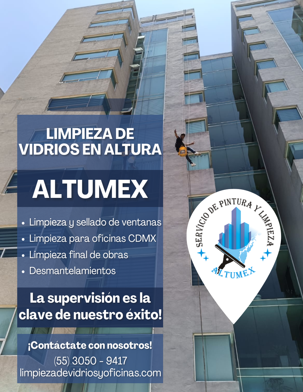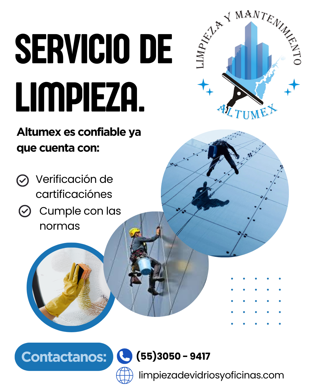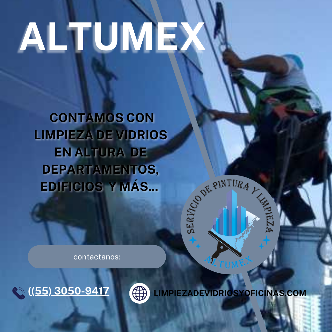 ALTUMEX, es una empresa que ofrece servicios de limpieza de vidrios en altura en la cdmx y mantenimiento en general, proporcionamos beneficios para tu empresa al contratarnos ya que los servicios de limpieza que ofrecemos no sólo es realizar limpieza de vidrios en altura si no es mantener lugares limpios y libres de infecciones y sobre todo obtener un lugar agradable donde puedan trabajar en armonía creando un ambiente laboral saludable y sobre todo limpio.