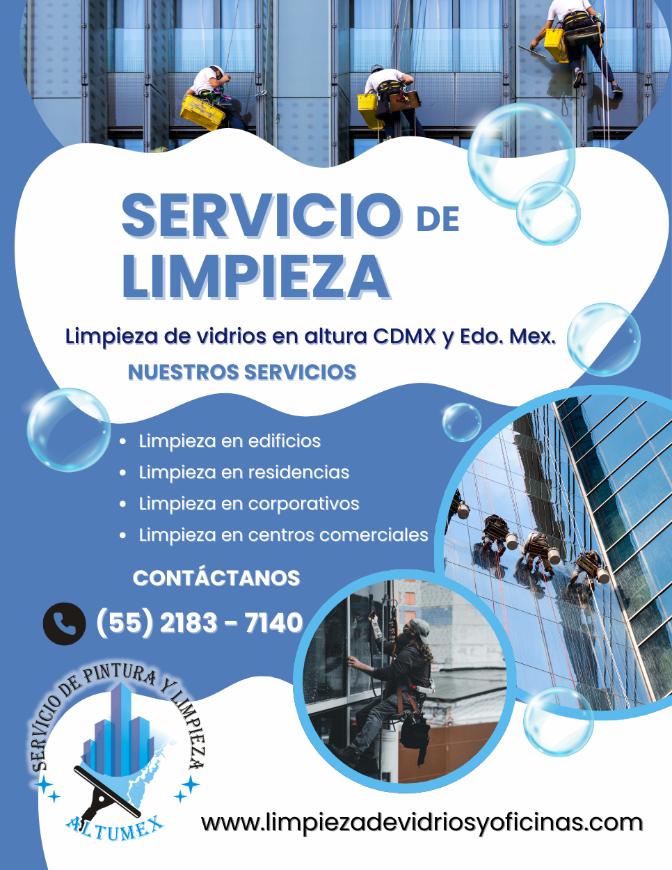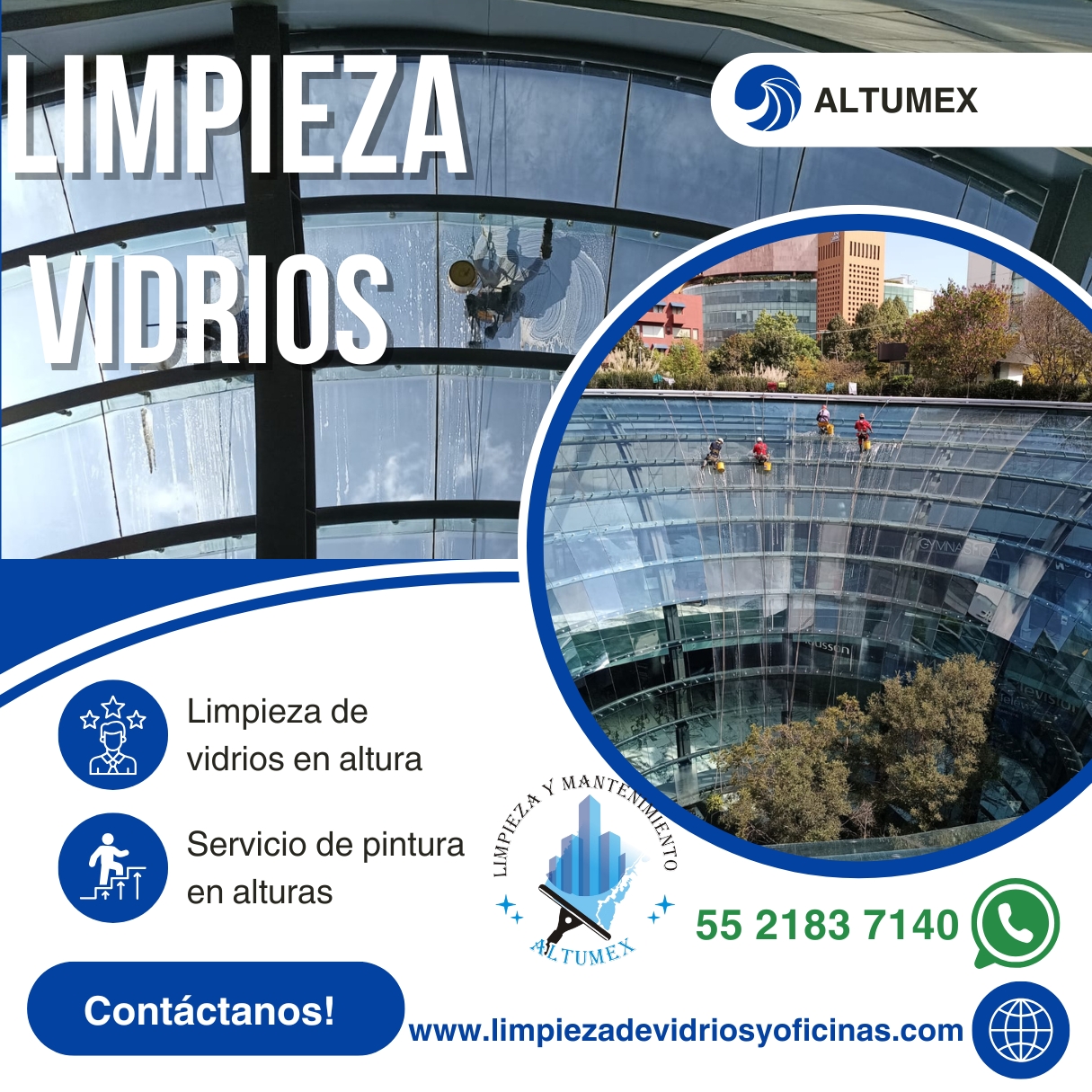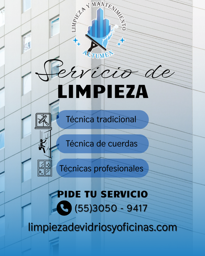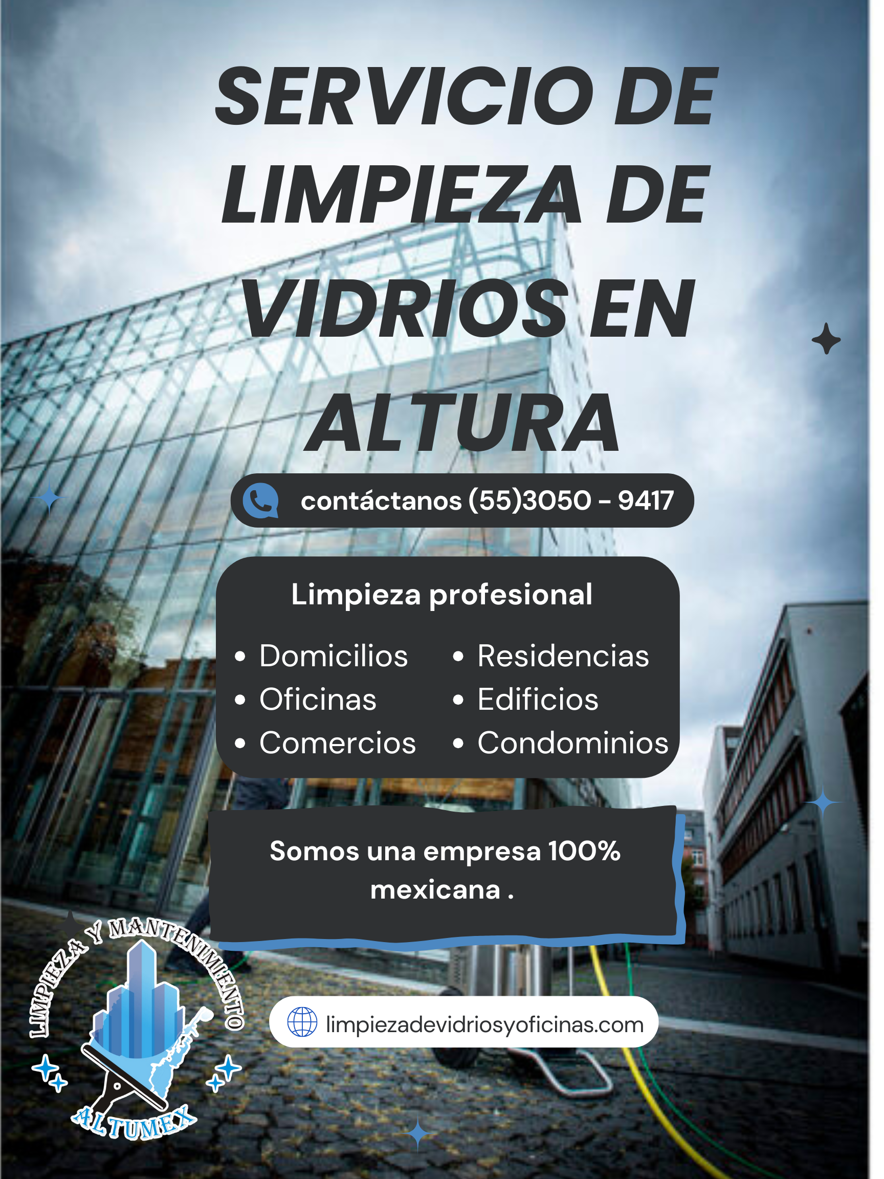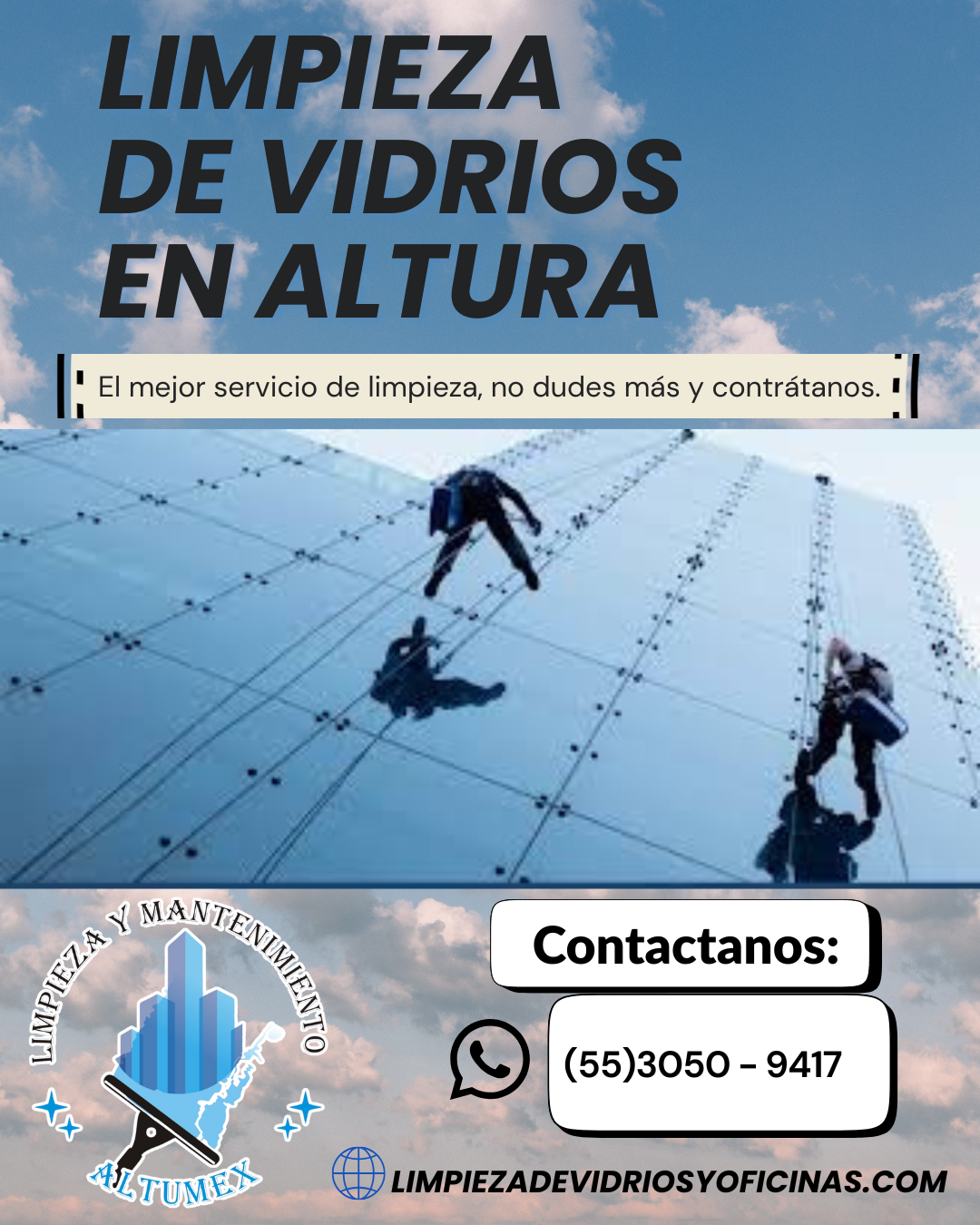 ALTUMEX, es una empresa que ofrece servicios de limpieza de vidrios en altura en la cdmx y mantenimiento en general, proporcionamos beneficios para tu empresa al contratarnos ya que los servicios de limpieza que ofrecemos no sólo es realizar limpieza de vidrios en altura si no es mantener lugares limpios y libres de infecciones y sobre todo obtener un lugar agradable donde puedan trabajar en armonía creando un ambiente laboral saludable y sobre todo limpio.