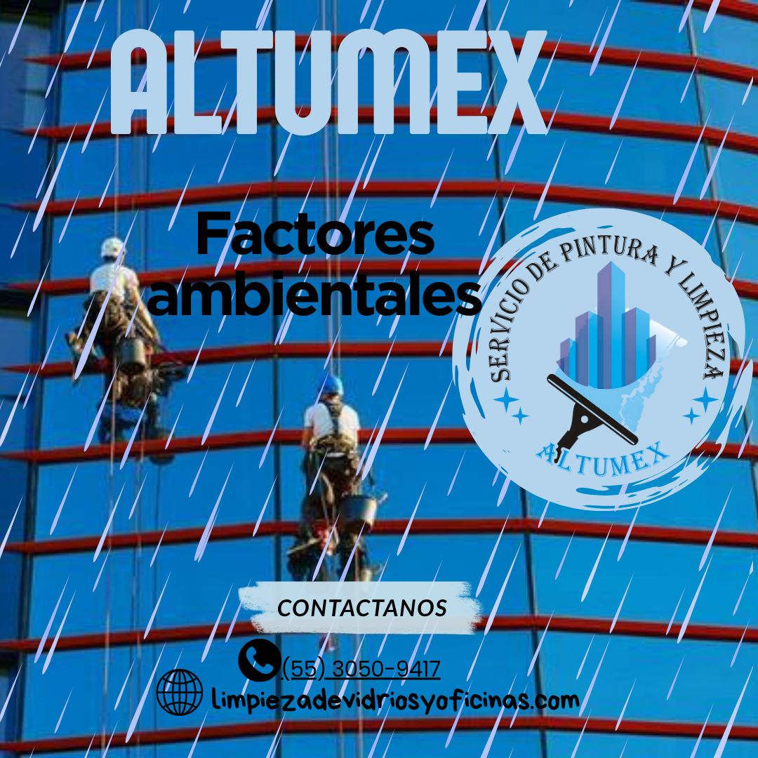 Los factores ambientales son los elementos del entorno, estos pueden ser vivos o no vivos, este tipo de factores interactúan con los seres vivos y esto afecta su desarrollo, supervivencia y cómo funciona los ecosistemas. Este tipo de factores suele afectar de forma negativa la seguridad del limpiador de ventanas de edificios. Algunos de los factores ambientales que se suelen presentar durante un servicio de limpieza de vidrios en altura son: viento fuerte, la lluvia (ya sea llovizna, lluvia contante o muy fuerte) o radiación solar excesiva aumentan los riesgos para el trabajador cuando realiza la limpieza de vidrios en altura. Por esto mismo es necesario que se conozcan todos los riesgos y se tomen medidas de seguridad para poder realizar el servicio de lavado de ventanas, de forma segura y buena.