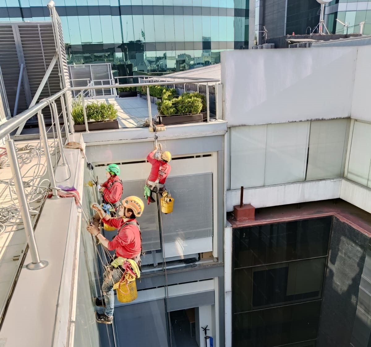 Conocido como "Rope Access" aclaramos que no es una plataforma, pero si es un método profesional más utilizado para realizar la limpieza de vidrios en altura. El limpiador de ventanas de edificios desciende mediante cuerdas certificadas que resulta ser más económico, más rápido y es perfecto para los edificios sin espacio para góndolas.